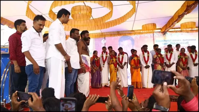 പാവപ്പെട്ട യുവതികളുടെ വിവാഹം നടത്തികൊടുത്ത് നടൻ വിശാൽ. പതിനൊന്ന് യുവതികളുടെ വിവാഹമാണ് വിശാൽ മുൻകൈ എടുത്ത് നടത്തിയത്. വിവാഹത്തിന്റെ മുഴുവൻ ചിലവുകളും വഹിച്ചതും കൂടാതെ, ദമ്പതിമാർക്ക് കൈ നിറയെ സമ്മാനവും വിശാൽ നൽകി. താരം തന്നെയാണ് ഓരോരുത്തർക്കും താലിയെടുത്ത് നൽകിയതും. തമിഴ്നാട്ടിലെ തിരുവള്ളൂരിലെ ഒരു സ്കൂളിലാണ് സമൂഹവിവാഹം നടന്നത്. വിശാൽ നേതൃത്വത്തം നൽകുന്ന സംഘടന ഇതിന് മുൻപും സാമൂഹ്യപ്രവർത്തനങ്ങൾ നടത്തിയിട്ടുണ്ട്. ഇത്തരത്തിൽ ഒരു സമൂഹ വിവാഹമെന്നത് തന്റെ ഏറ്റവും വലിയ ആഗ്രഹമായിരുന്നുവെന്നും വിശാൽ അഭിപ്രായപ്പെട്ടു. തനിക്ക് ഇപ്പോൾ പതിനൊന്ന് സഹോദരിമാരുണ്ടെന്നും അവരുടെ സന്തോഷമാണ് തന്നെ സംബന്ധിച്ചിടത്തോളം ഏറ്റവും വലിയ കാര്യമെന്നും വിശാൽ പറയുന്നു. ഇവരുടെ കുട്ടികളുടെ വിദ്യാഭ്യാസ ചിലവും വിശാൽ ഏറ്റെടുക്കും. തന്റെ നേതൃത്വത്തിലുള്ള സംഘടന വഴി മറ്റുള്ള ജില്ലകളിലും സമൂഹ വിവാഹം സംഘടിപ്പിക്കുമെന്നും വിശാൽ അറിയിച്ചു.